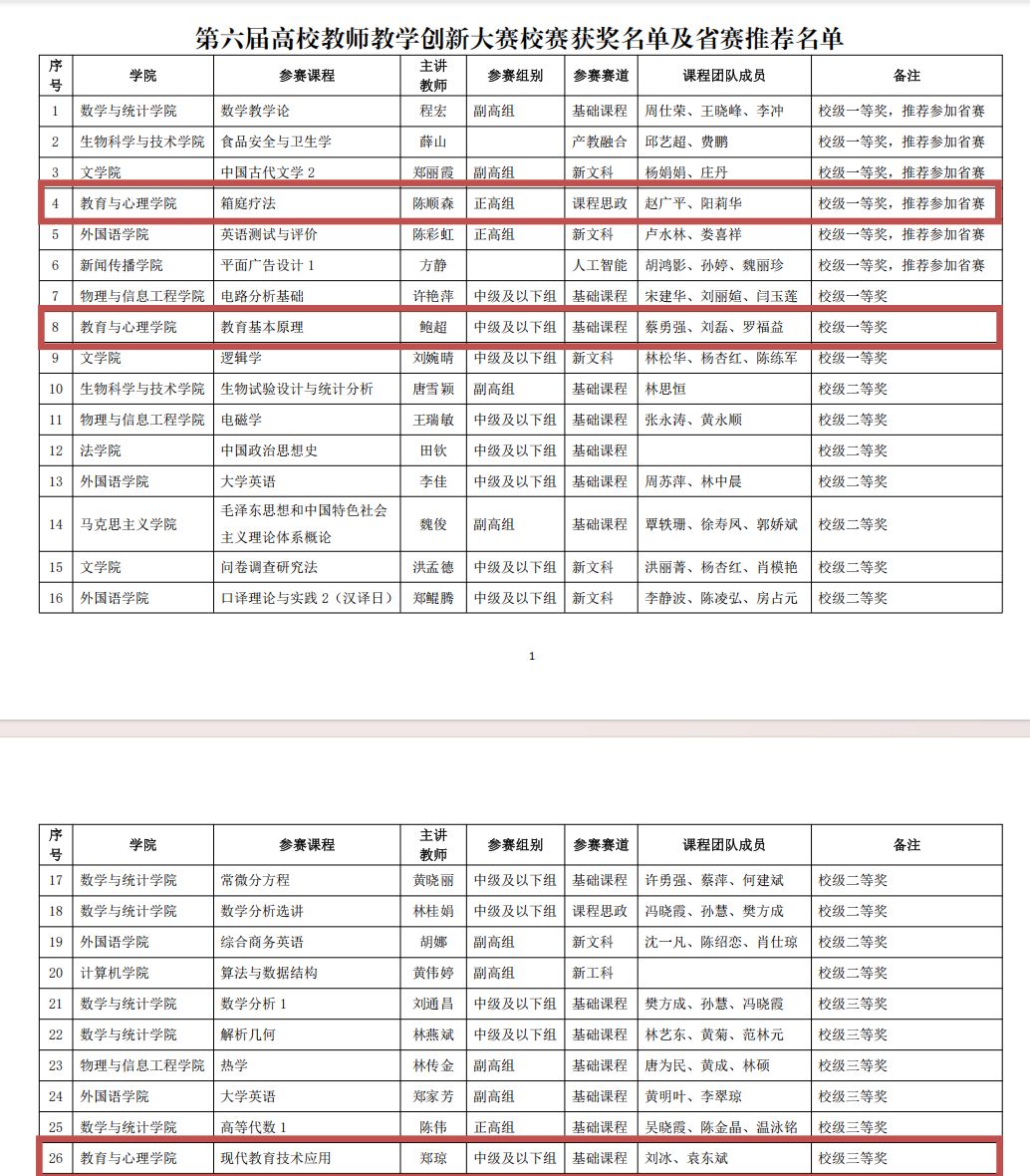 近日,闽南师范大学第六届本科教师教学创新大赛结果揭晓。根据《闽南师范大学本科教师教学创新大赛实施方案(闽南师大〔2025〕180号)》和《闽南师范大学关于举办第六届本科教师教学创新大赛的通知》(教务〔2025〕195号),经专家评审,我院多位教师获奖:陈顺森主讲的《箱庭疗法》课程获“课程思政”赛道一等奖,鲍超主讲的《教育基本原理》课程获“基础课程”赛道一等奖,郑琼主讲的《现代教育技术应用》课程获“基础课程”赛道三等奖。其中,陈顺森课程团队被推荐参加第六届福建省本科高校教师教学创新大赛。